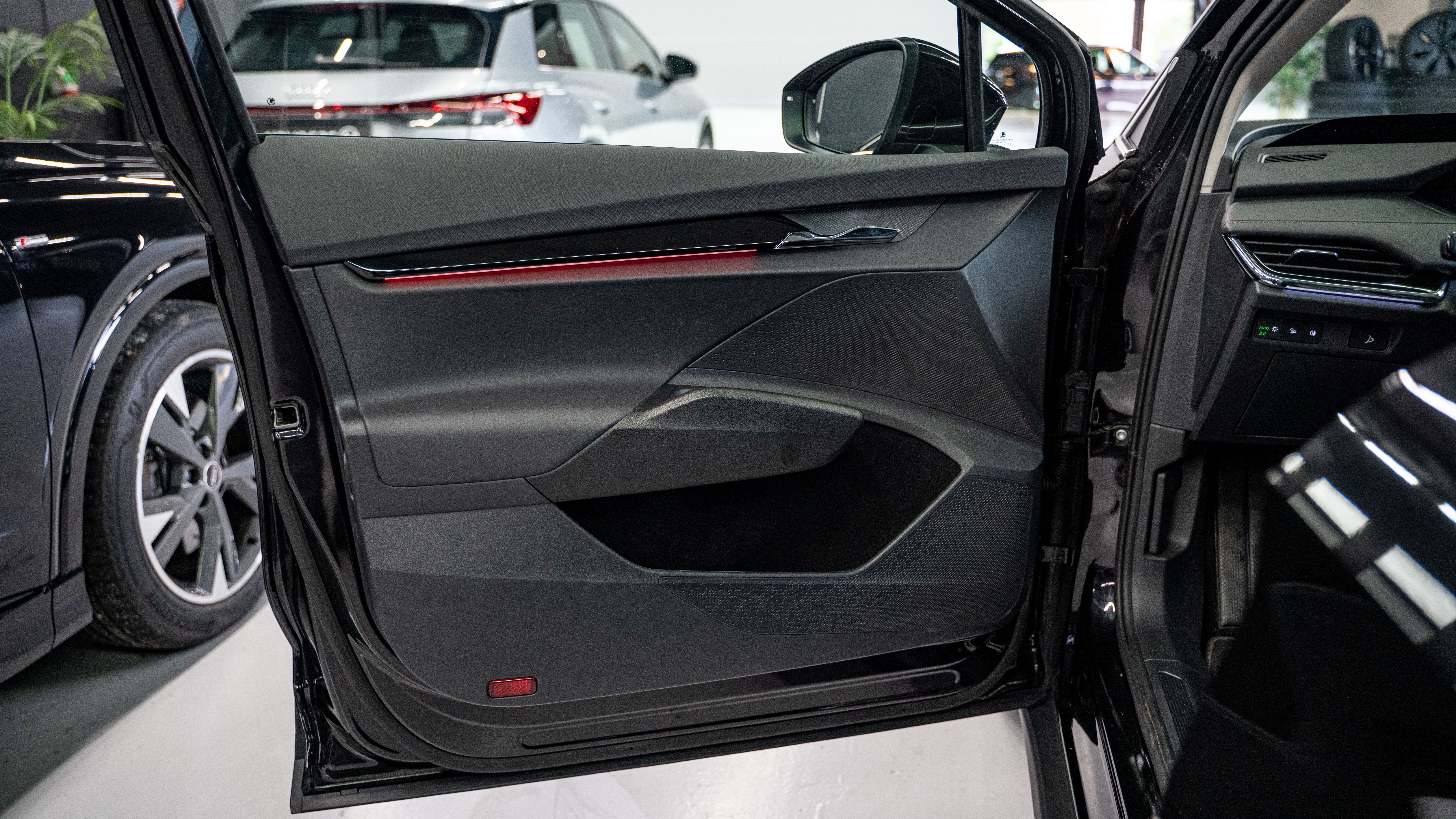 🛋️ Komfort & design Læderrat med varme El-komfortsæder m. memory Læderindtræk 3-zoners klimaanlæg og aircondition Nøglefri adgang og start Ambient belysning og områdebelysning 20” alufælge og mørktonede ruder bag